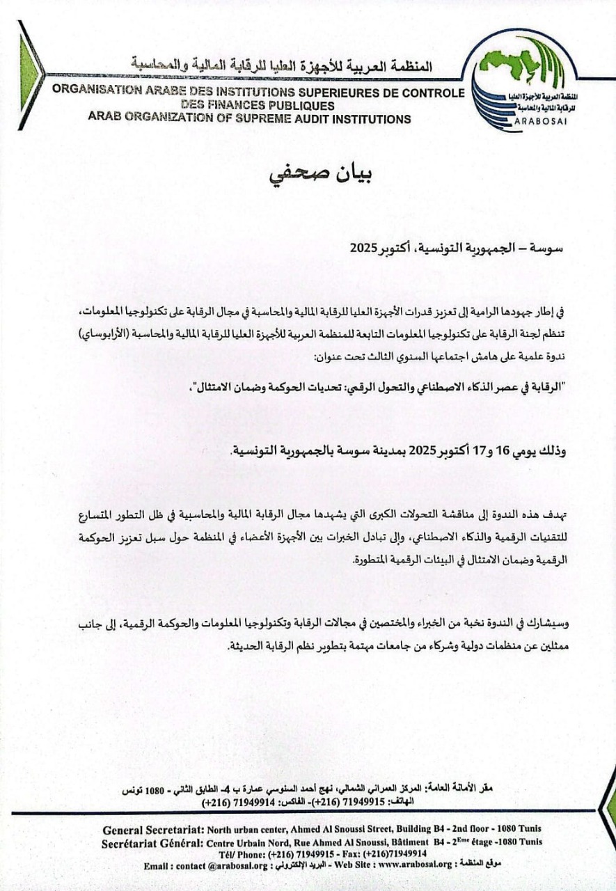 تأسست المنظمة العربية للأجهزة العليا للرقابة المالية والـمحاسبة سنة 1976 وفـقا لمحضر الاجتماع التأسيسي لرؤساء هذه الأجهزة الـمـنعقد بالقاهرة في نفس السنة. وقد تـم تنـظـيم العمل فـيها بموجـب اللوائح التأسيسية والتنظيمية الصادرة سـنة 1976.
